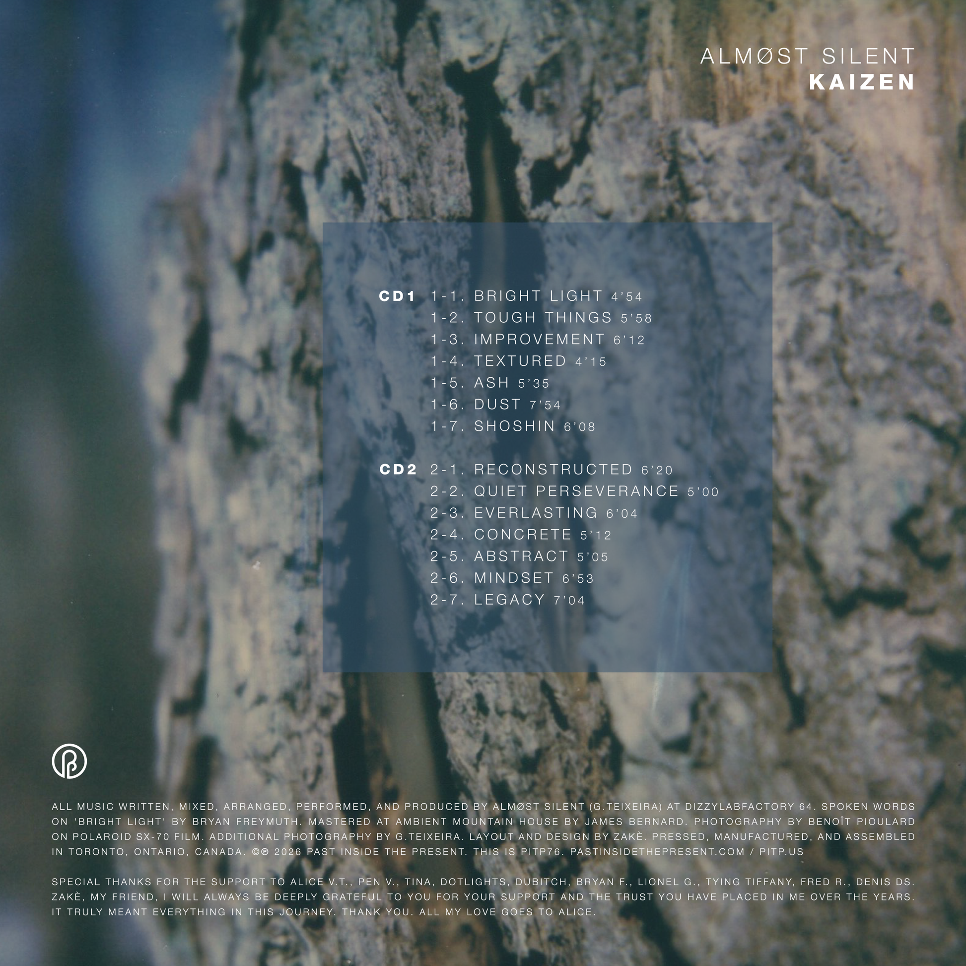 All music written, mixed, arranged, performed, and produced by Almøst Silent (G.Teixeira) at DizzyLabFactory 64. Spoken words on 'Bright Light' by Bryan Freymuth. Mastered at Ambient Mountain House by James Bernard. Photography by Benoît Pioulard on Polaroid SX-70 film. Additional photography by G.Teixeira. Layout and design by zakè. Pressed, manufactured, and assembled in Toronto, Ontario, Canada. ©℗ 2026 Past Inside the Present. This is PITP76. pastinsidethepresent.com / pitp.us